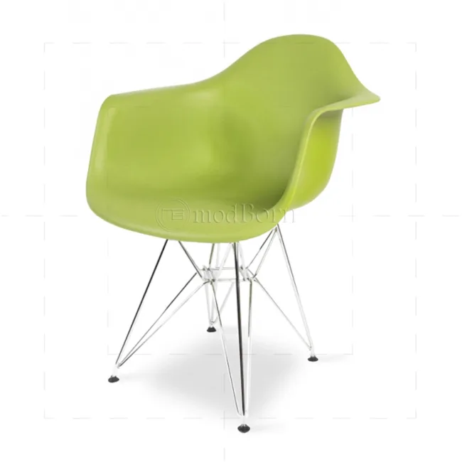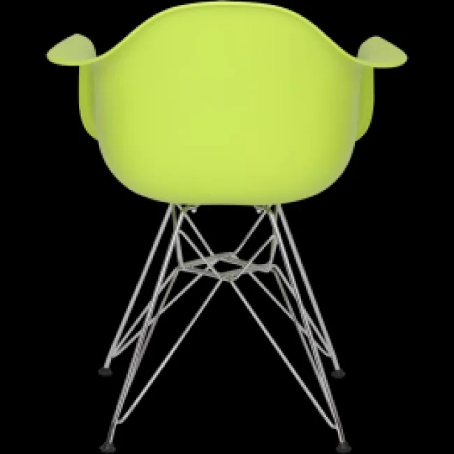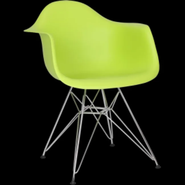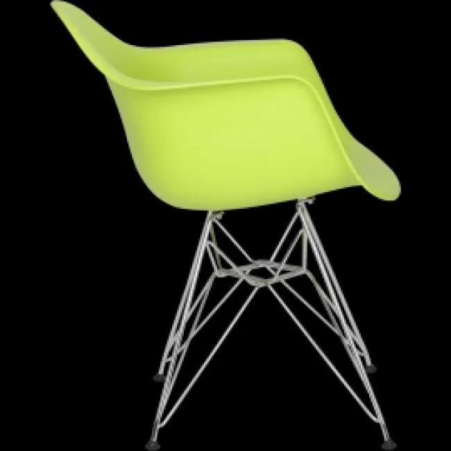 The Eames Style Dining DAR Arm Chair Green is a modern interpretation of the 1950 DAR silhouette — a fully pigmented ABS shell shaped for comfort, set on a chrome Eiffel base. It suits dining rooms, kitchens, breakout spaces and contemporary offices where a compact, sculptural seat is needed.