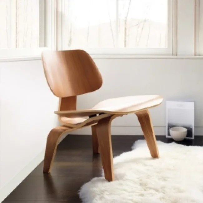 - Classic LCW-inspired molded plywood seat & back in walnut finish, ergonomic low-seat lounge profile.