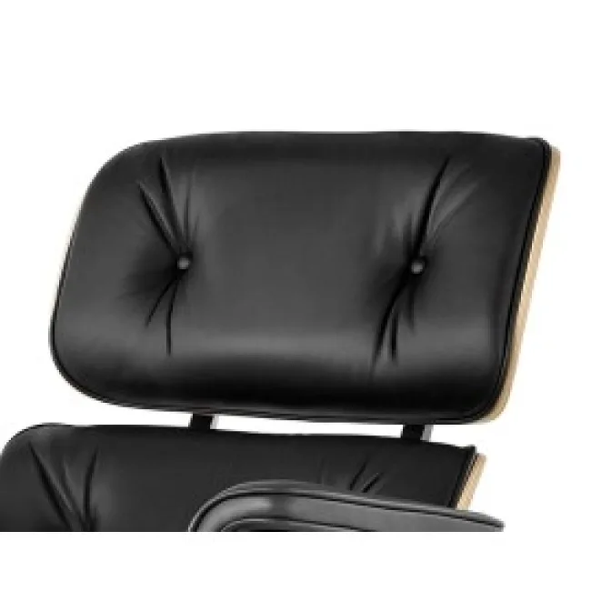 - Eames-style lounge chair + matching ottoman in black genuine Italian leather and oak plywood