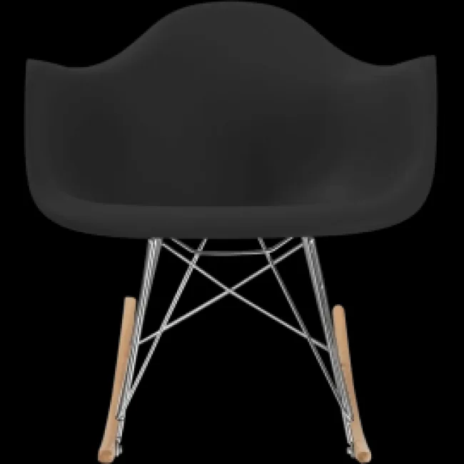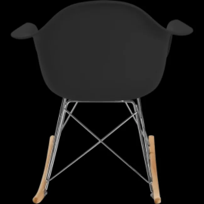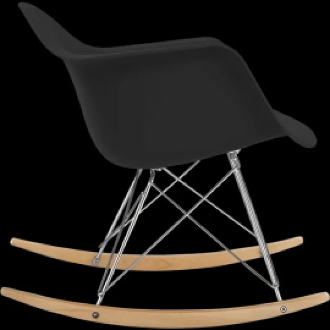A black Eames-style RAR rocking arm chair combining a moulded ABS seat, black steel frame and solid maple rockers. Ergonomic sculpted seat and smooth rocking motion make it ideal for living rooms, reading nooks and modern offices.