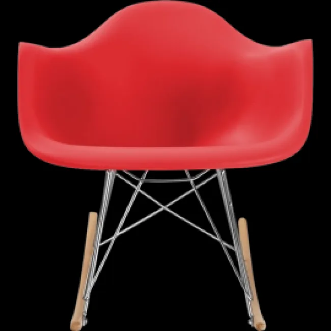 - Classic Eames-style RAR rocking arm chair in red — ergonomic waterfall edge seat and flexible back.