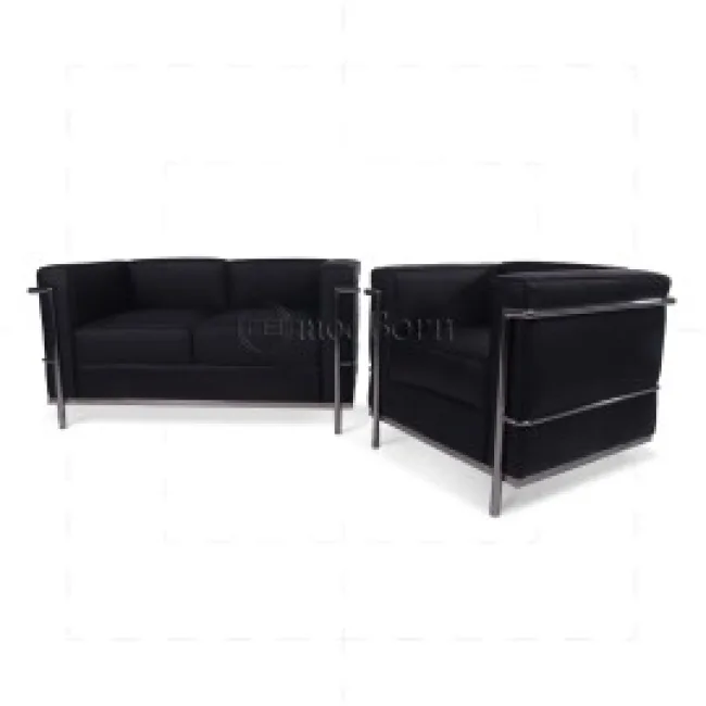 - Elegant modernist LC2 silhouette in black genuine Italian leather.