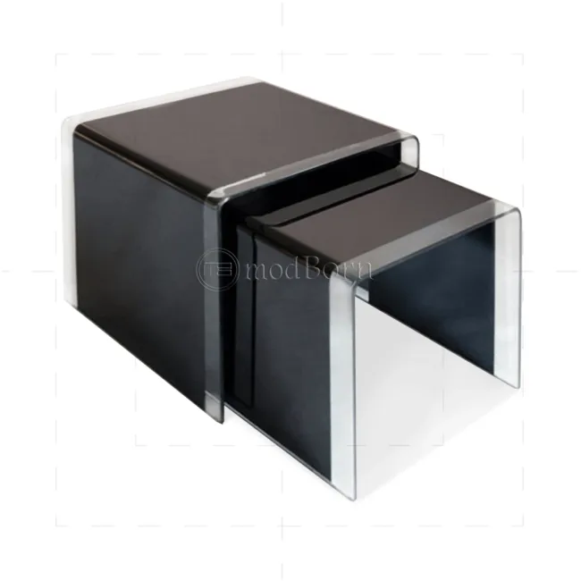 - Modern bent toughened glass nesting tables with black finish and decorative strips