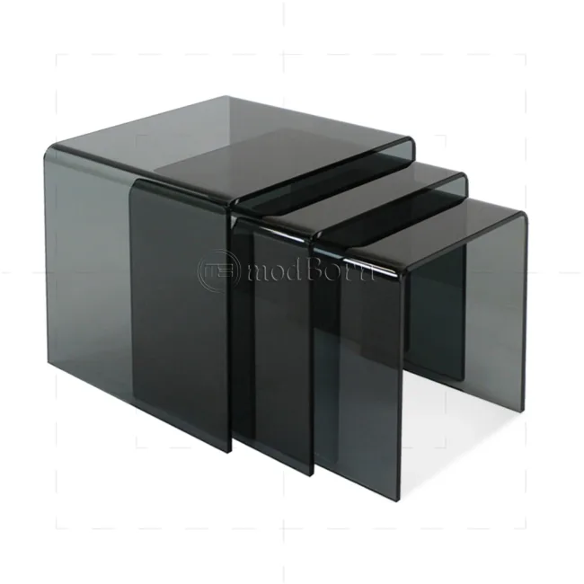 Short summary: A premium, minimalist nest-of-3 table set made from 12mm toughened bent glass in a grey finish. Stackable design saves space while adding modern flair to living rooms, receptions, or offices.