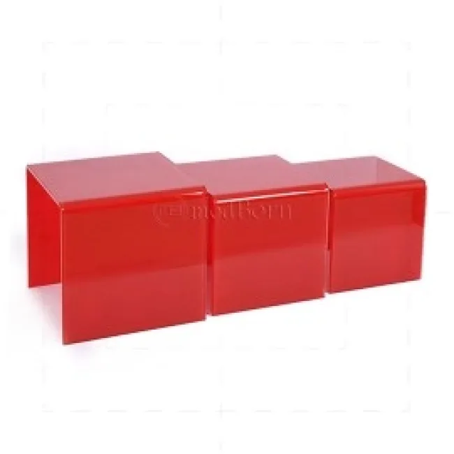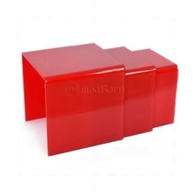 Short summary: A stackable set of three bent toughened glass coffee/side tables in bold red. Space-saving, sculptural curves in 12mm safety glass give a premium, modern focal point for living rooms and reception areas.
