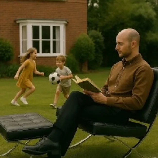 Poltrona lounge con pouf in pelle italiana marrone scuro e rivestimento in pannelli di noce: design iconico, comfort ergonomico e materiali premium. Ideale per salotti di lusso, studi ed ambienti contemporanei.